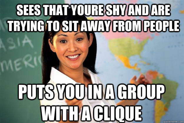Sees that youre shy and are trying to sit away from people Puts you in a group with a clique