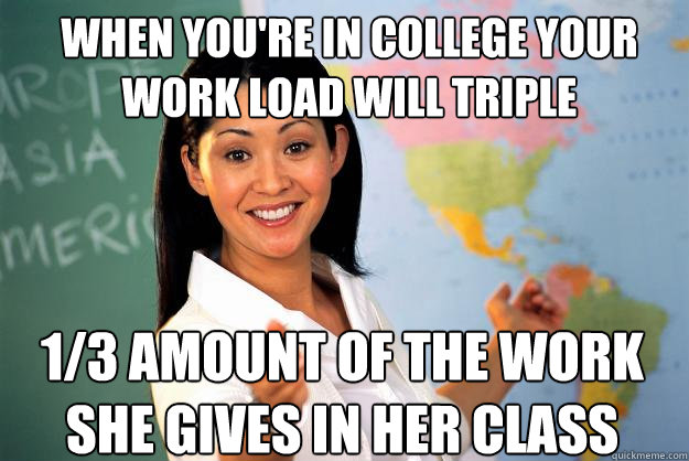 When you're in college your work load will triple 1/3 amount of the work she gives in her class
