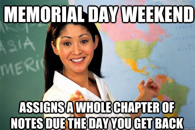 Memorial Day weekend assigns a whole chapter of notes due the day you get back