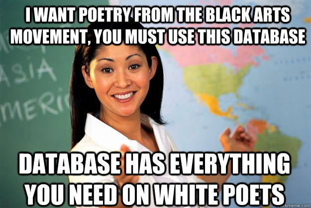 I want Poetry from the Black Arts Movement, you must use this database Database has everything you need on white poets