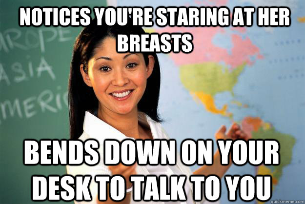 Notices you're staring at her breasts bends down on your desk to talk to you