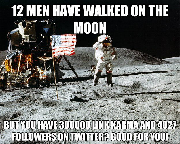 12 men have walked on the moon but you have 300000 link Karma and 4027 followers on twitter? Good for you!