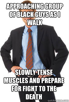 approaching group of black guys as i walk slowly tense muscles and prepare for fight to the death