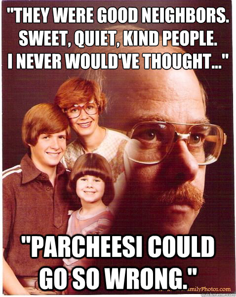"They were good neighbors. Sweet, quiet, kind people. I Never would've thought..." "Parcheesi could go so wrong."