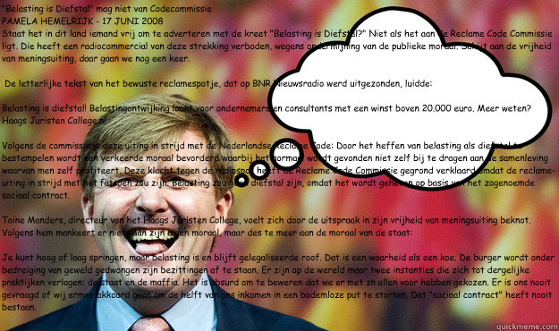 "Belasting is Diefstal" mag niet van Codecommissie PAMELA HEMELRIJK - 17 JUNI 2008 Staat het in dit land iemand vrij om te adverteren met de kreet "Belasting is Diefstal?" Niet als het aan de Reclame Code Commissie ligt. Die heeft een radiocommercial van