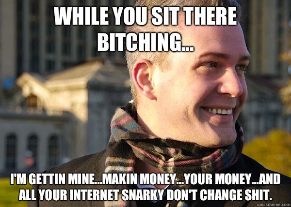 While you sit there bitching... I'm gettin mine...makin money...YOUR money...and all your internet snarky don't change shit.