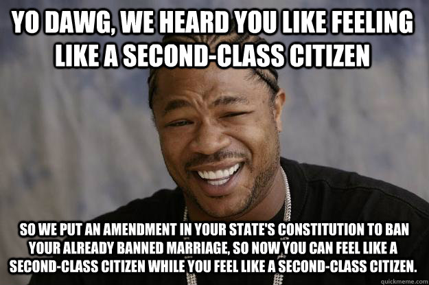 YO DAWG, we heard you like feeling like a second-class citizen so we put an amendment in your state's constitution to ban your already banned marriage, so now you can feel like a second-class citizen while you feel like a second-class citizen.