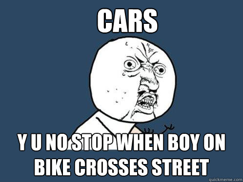 Cars y u no stop when boy on bike crosses street