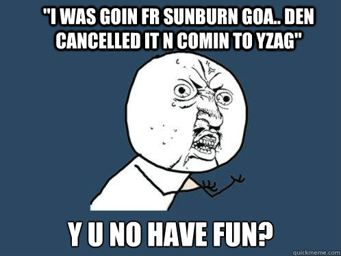 "i was goin fr sunburn goa.. den cancelled it n comin to yzag" Y U NO HAVE FUN?