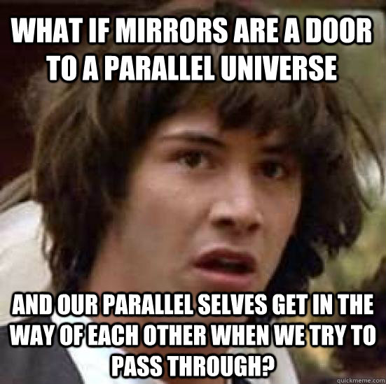 what if mirrors are a door to a parallel universe and our parallel selves get in the way of each other when we try to pass through?