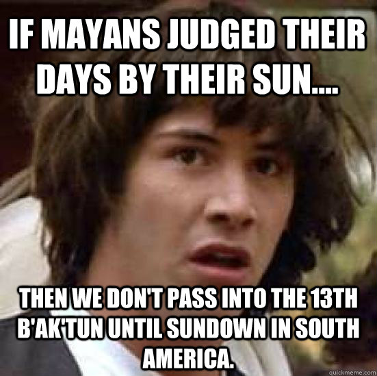 if mayans judged their days by their sun.... Then we don't pass into the 13th B'ak'Tun until sundown in south america.