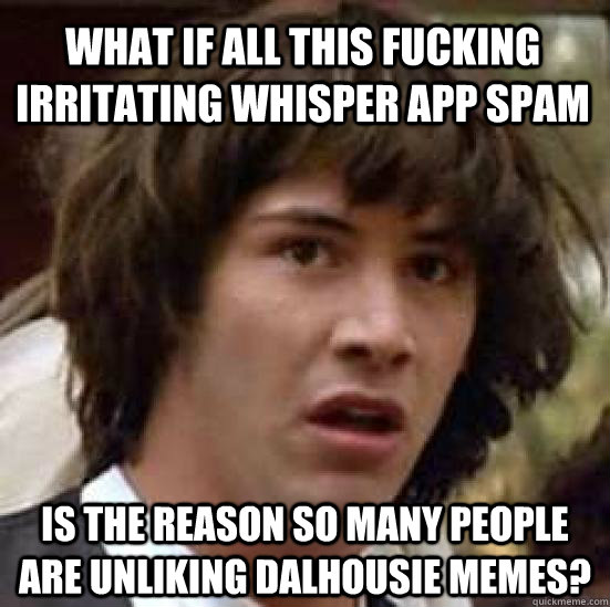 What if all this fucking irritating Whisper App spam Is the reason so many people are unliking Dalhousie Memes?