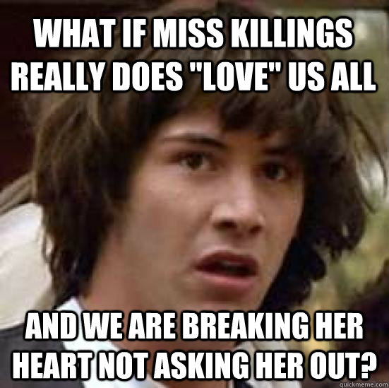 what if Miss Killings really does "love" us all and we are breaking her heart not asking her out?