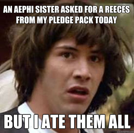 An Aephi sister asked for a reeces from my pledge pack today but i ate them all