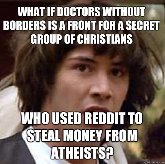 What if doctors without borders is a front for a secret group of Christians Who used reddit to steal money from atheists?
