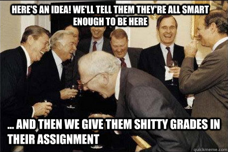 Here's an idea! We'll tell them they're all smart enough to be here ... and then we give them shitty grades in their assignment