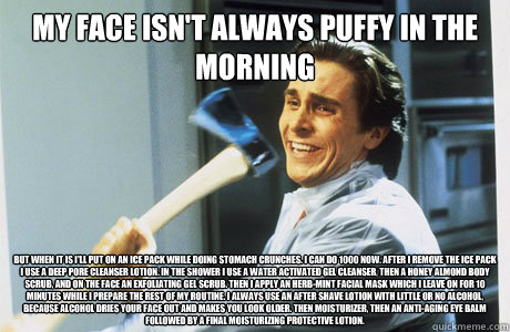 My face isn't always puffy in the morning But when it is I'll put on an ice pack while doing stomach crunches. I can do 1000 now. After I remove the ice pack I use a deep pore cleanser lotion. In the shower I use a water activated gel cleanser, then a hon