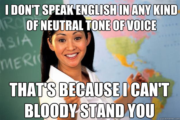 i don't speak english in any kind of neutral tone of voice that's because i can't bloody stand you - i don't speak english in any kind of neutral tone of voice that's because i can't bloody stand you  Unhelpful High School Teacher