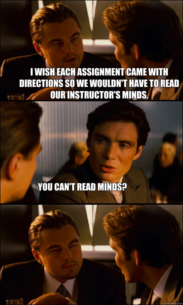 I wish each assignment came with directions so we wouldn't have to read our instructor's minds. You can't read minds? - I wish each assignment came with directions so we wouldn't have to read our instructor's minds. You can't read minds?  Inception