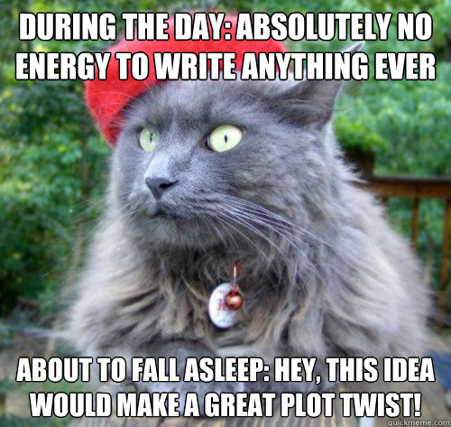 During the day: absolutely no energy to write anything ever About to fall asleep: hey, this idea would make a great plot twist!
