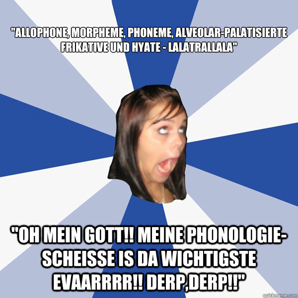 "Allophone, Morpheme, Phoneme, alveolar-palatisierte Frikative und Hyate - lalatrallala" "Oh mein Gott!! Meine Phonologie-Scheisse is DA WICHTIGSTE EVAARRRR!! Derp,derp!!"