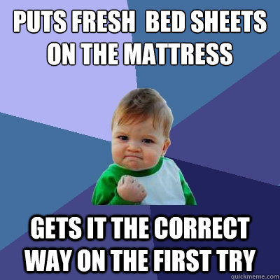 Puts fresh  bed sheets on the mattress Gets it the correct way on the first try - Puts fresh  bed sheets on the mattress Gets it the correct way on the first try  Success Kid