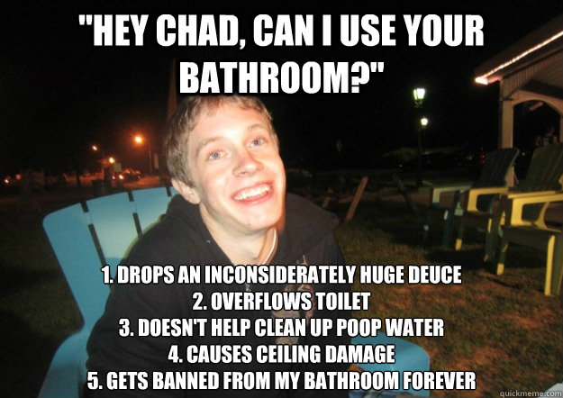 "Hey Chad, can i use your bathroom?" 1. drops an inconsiderately huge deuce 2. overflows toilet 3. doesn't help clean up poop water 4. causes ceiling damage 5. gets banned from my bathroom forever