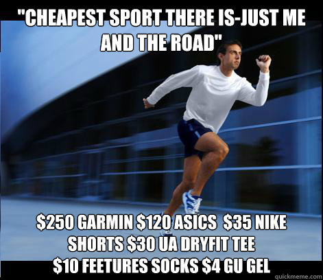"Cheapest sport there is-just me and the road" $250 Garmin $120 Asics $35 Nike Shorts $30 UA Dryfit Tee $10 Feetures Socks $4 GU Gel