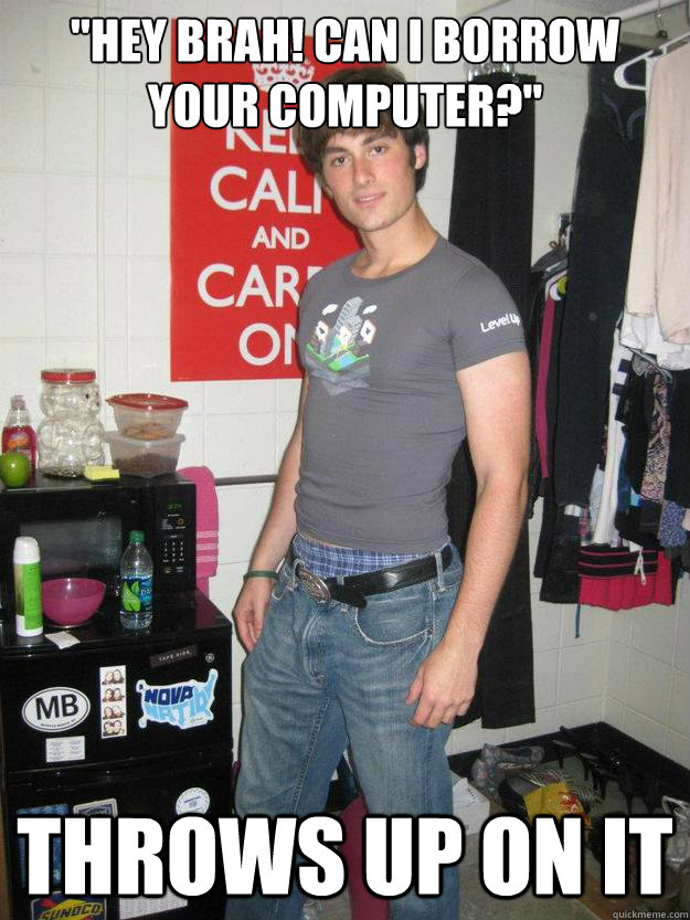 "Hey brah! Can I borrow your computer?" Throws up on it