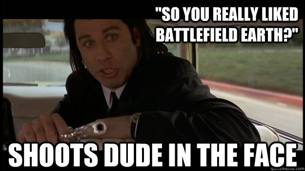 "so you really liked battlefield earth?" shoots dude in the face