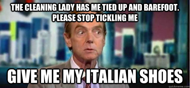 the cleaning lady has me tied up and barefoot. please stop tickling me give me my italian shoes