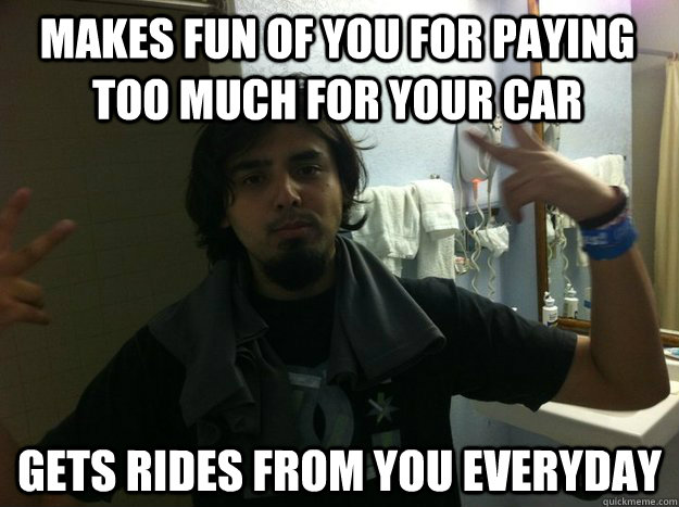 Makes fun of you for paying too much for your car Gets rides from you everyday