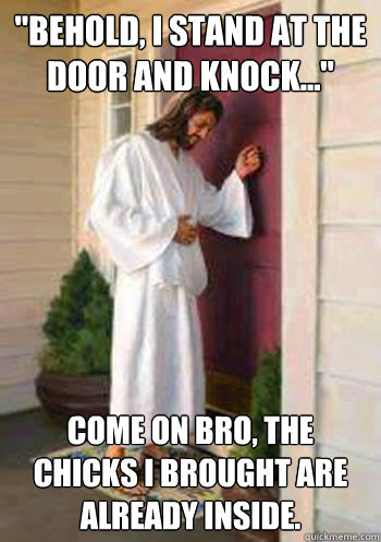 "Behold, I stand at the door and knock..." Come on Bro, the chicks I brought are already inside.