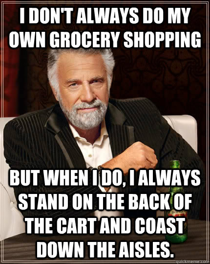 I don't always do my own grocery shopping but when I do, I always stand on the back of the cart and coast down the aisles. - I don't always do my own grocery shopping but when I do, I always stand on the back of the cart and coast down the aisles.  The Most Interesting Man In The World