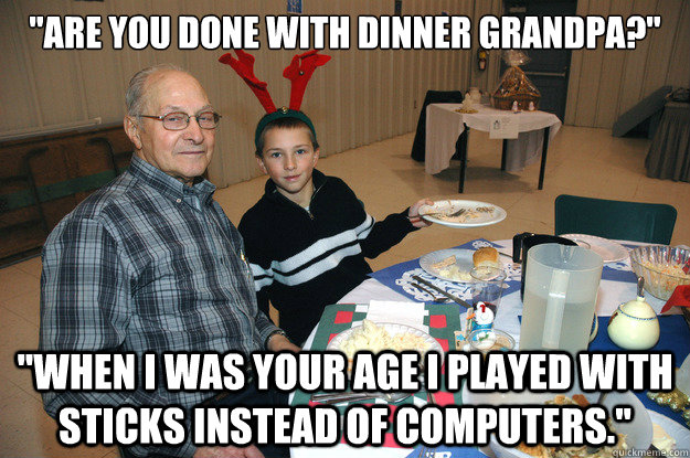 "Are you done with dinner grandpa?" "When I was your age I played with sticks instead of computers."