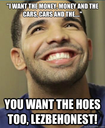 "I want the money, money and the cars, cars and the...." You want the hoes too, lezbehonest!