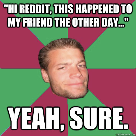 "HI REDDIT, THIS HAPPENED TO MY FRIEND THE OTHER DAY..." YEAH, SURE.