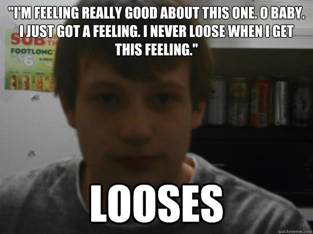 "I'm feeling really good about this one. O baby. I just got a feeling. I never loose when I get this feeling." looses