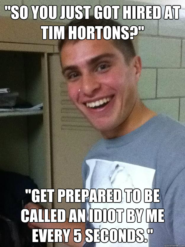 "So you just got hired at Tim Hortons?" "Get prepared to be called an idiot by me every 5 seconds."