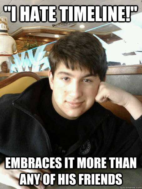 "I hate timeline!" Embraces it more than any of his friends