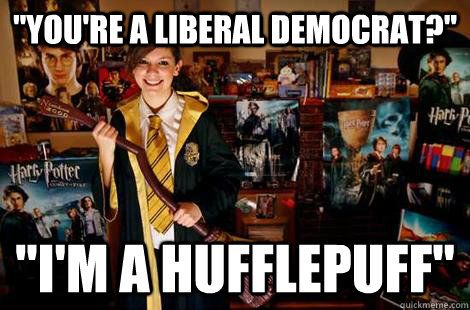 "You're a Liberal Democrat?" "I'm a Hufflepuff"