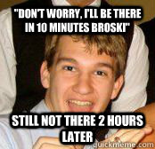 "Don't worry, I'll be there in 10 minutes broski" Still not there 2 hours later