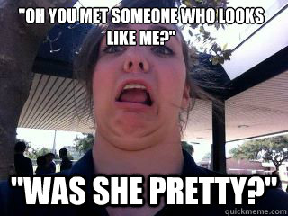 "Oh you met someone who looks like me?" "Was she pretty?"