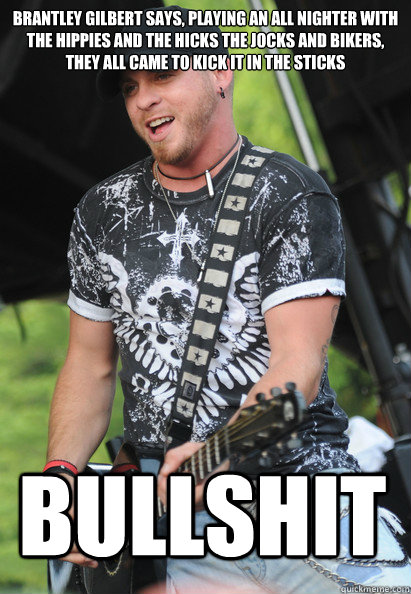 Brantley Gilbert says, Playing an all nighter with the hippies and the hicks The jocks and bikers, they all came to kick it in the sticks Bullshit