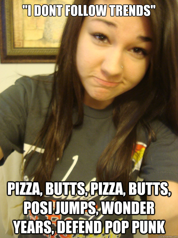 "I dont follow trends" pizza, butts, pizza, butts, posi jumps, wonder years, defend pop punk