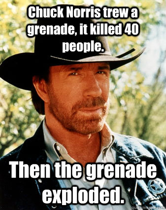Chuck Norris trew a grenade, it killed 40 people. Then the grenade exploded.
