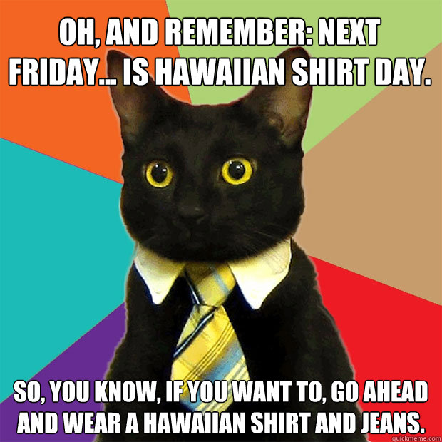 Oh, and remember: next Friday... is Hawaiian shirt day.  So, you know, if you want to, go ahead and wear a Hawaiian shirt and jeans.  - Oh, and remember: next Friday... is Hawaiian shirt day.  So, you know, if you want to, go ahead and wear a Hawaiian shirt and jeans.   Business Cat