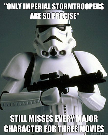 "Only Imperial stormtroopers are so precise" Still misses every major character for three movies