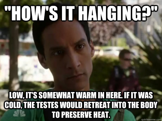 "How's it hanging?" Low, it's somewhat warm in here. If it was cold, the testes would retreat into the body to preserve heat.