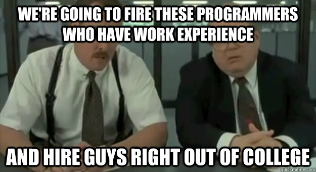 We're going to fire these programmers who have work experience and hire guys right out of college